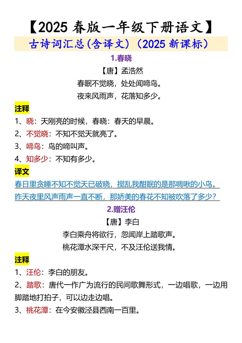 2025春新版【一年级下册语文】古诗词汇总(含译文)