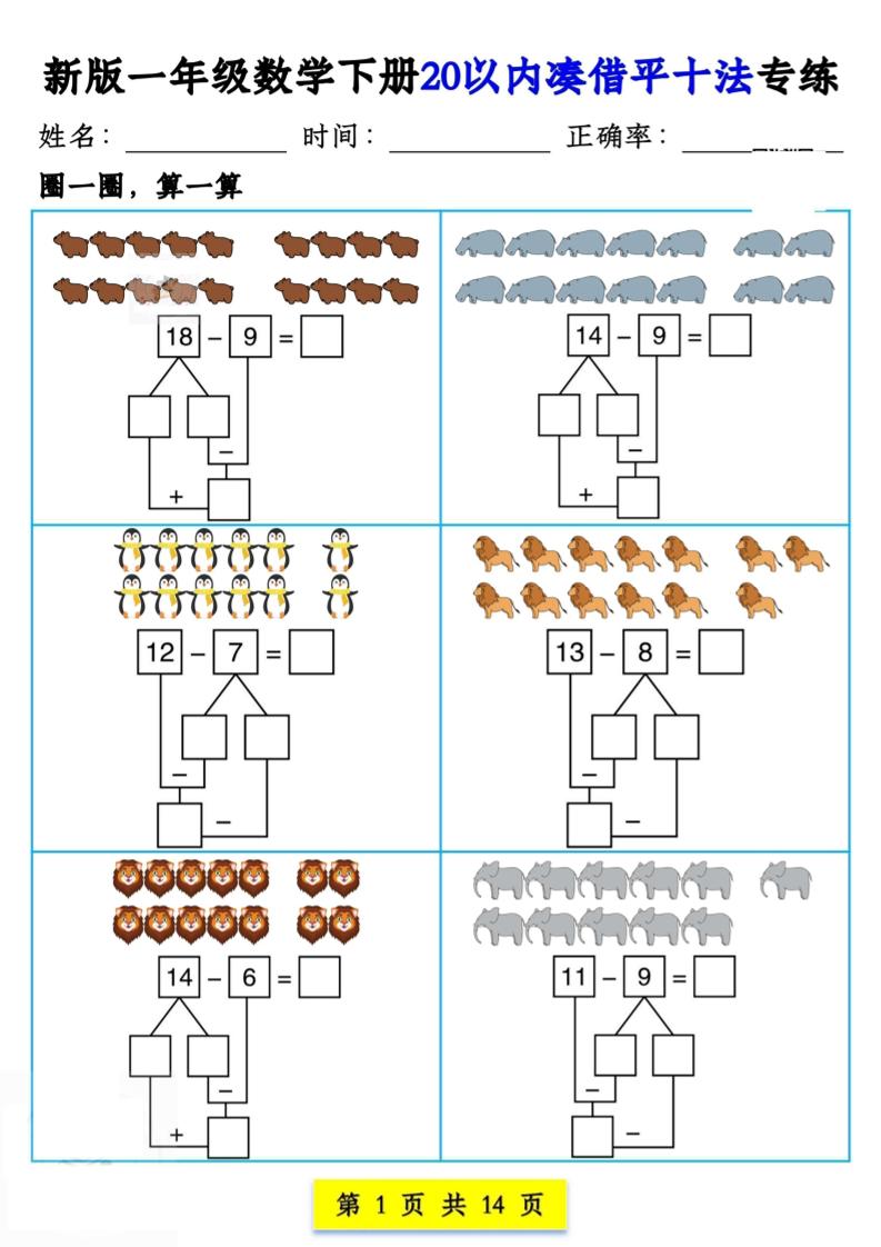 新版一年级数学下册20以内凑借平十法专练14页