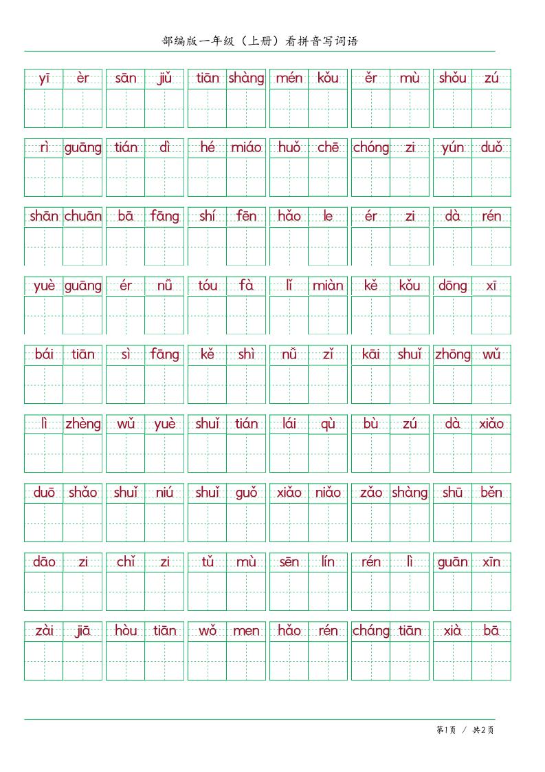 新一上语文写字表练字帖(生字拼音描红100字)10页