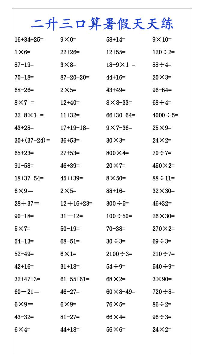 二升三数学暑假《口算练习题114道》汇总-三上数学