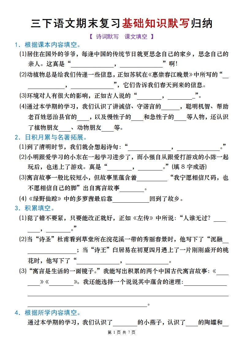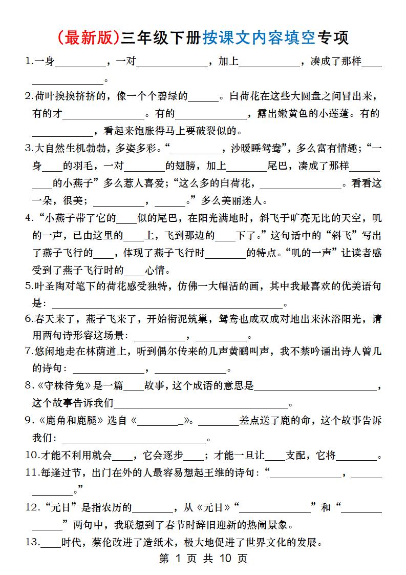 1-8单元期末复习考点:根据课文内容填空(必刷27题)三下语文