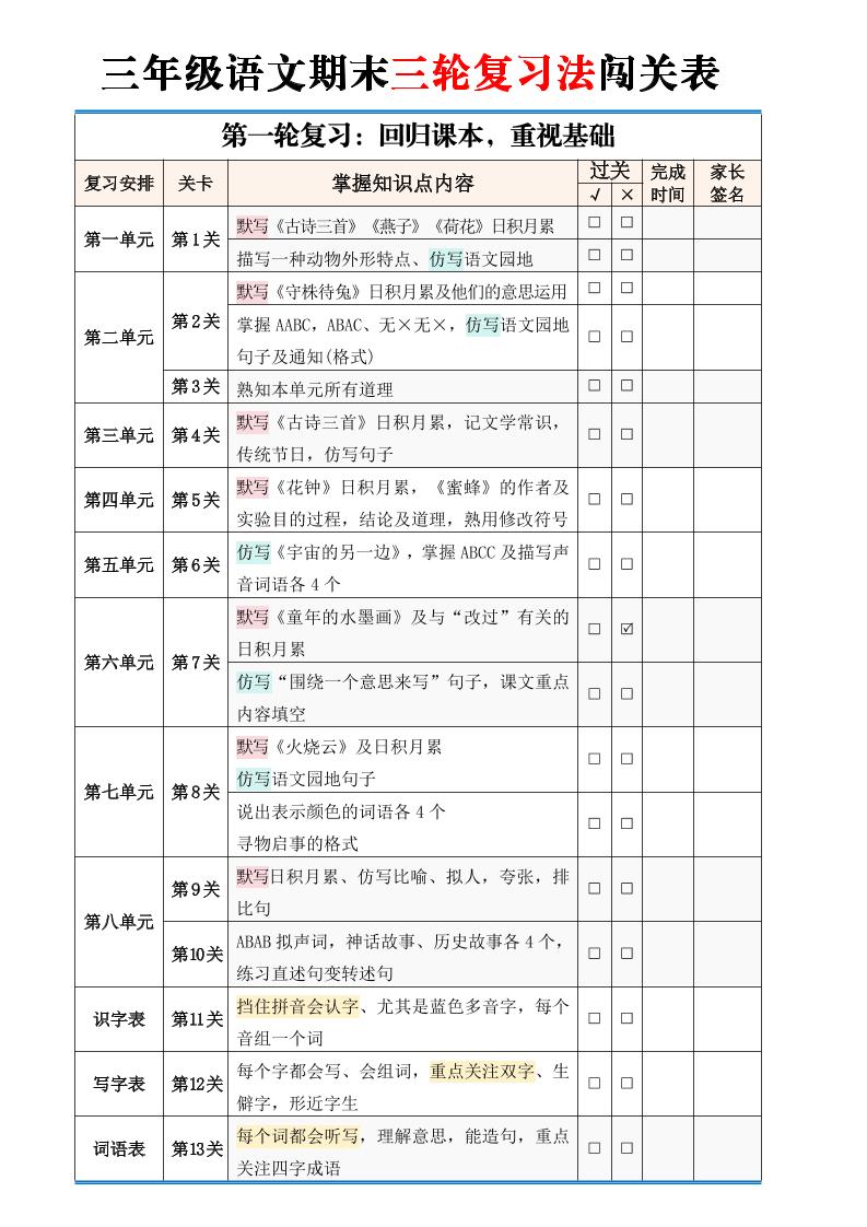 三下丨语文 期末复习计划三轮复习法(背诵打卡表)