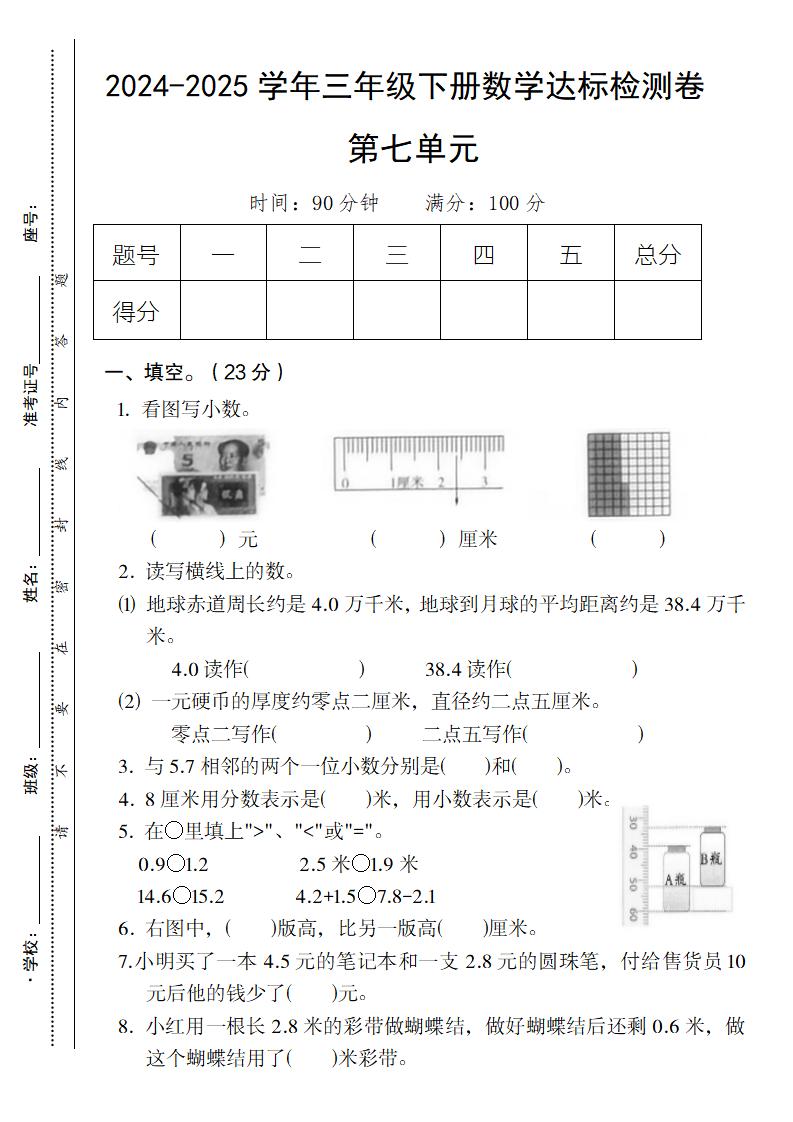 【数学】【人教版】2024-2025学年三年级下册数学达标检测卷第七单元