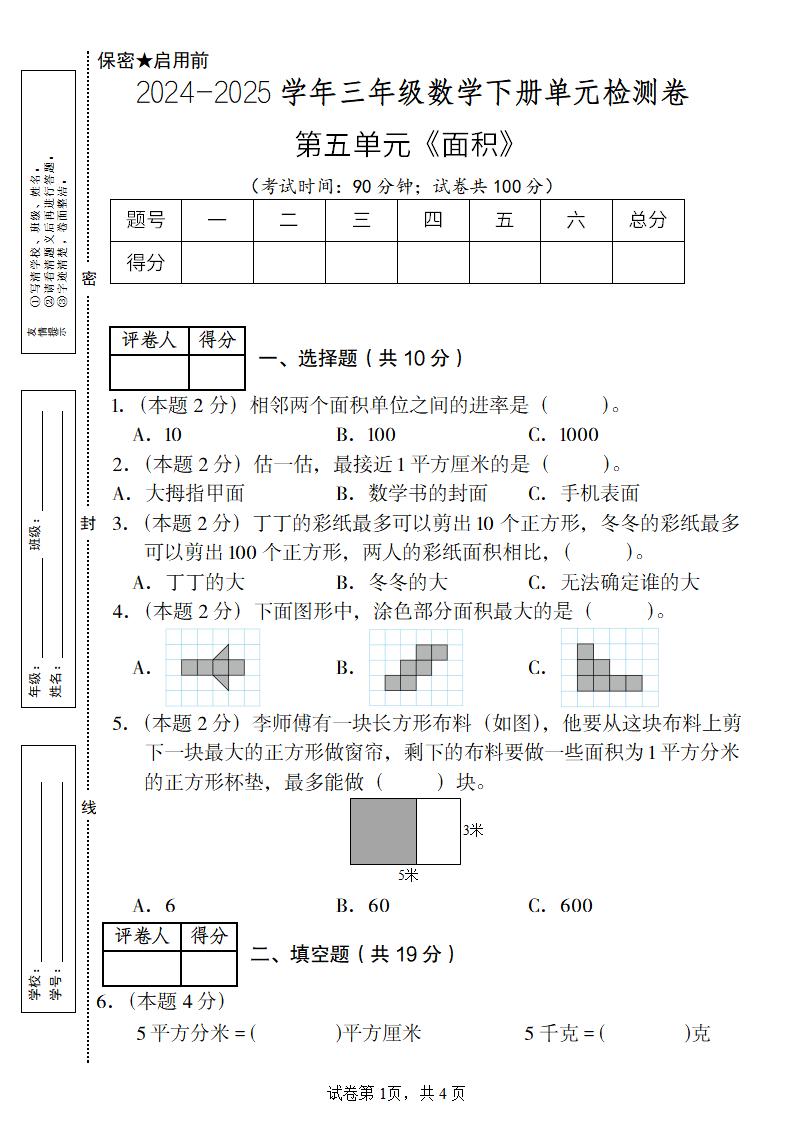 【数学】【北师大版】2024-2025学年三年级数学下册单元检测卷第五单元《面积》