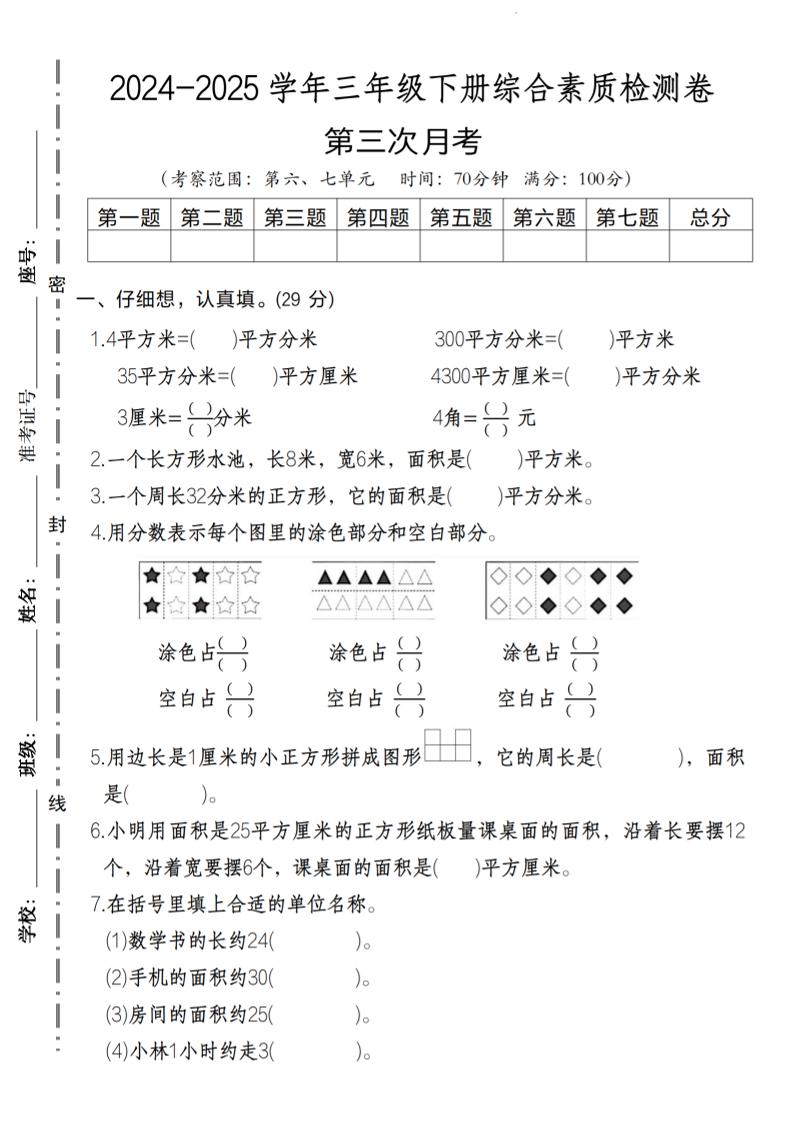 【数学】【苏教版】2024-2025学年三年级下册综合素质检测卷第三次月考