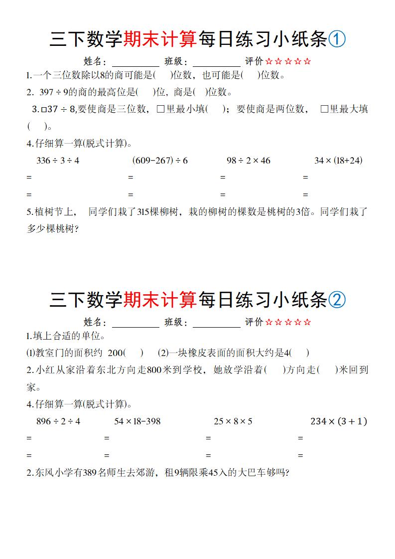 【数学】【通用】三下数学期末计算每日练习小纸条(无答案)
