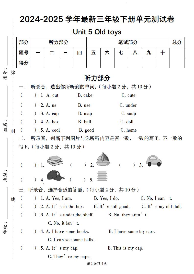 【英语】【人教pep版】2024-2025学年最新三年级下册单元测试卷Unit 5 Old toys