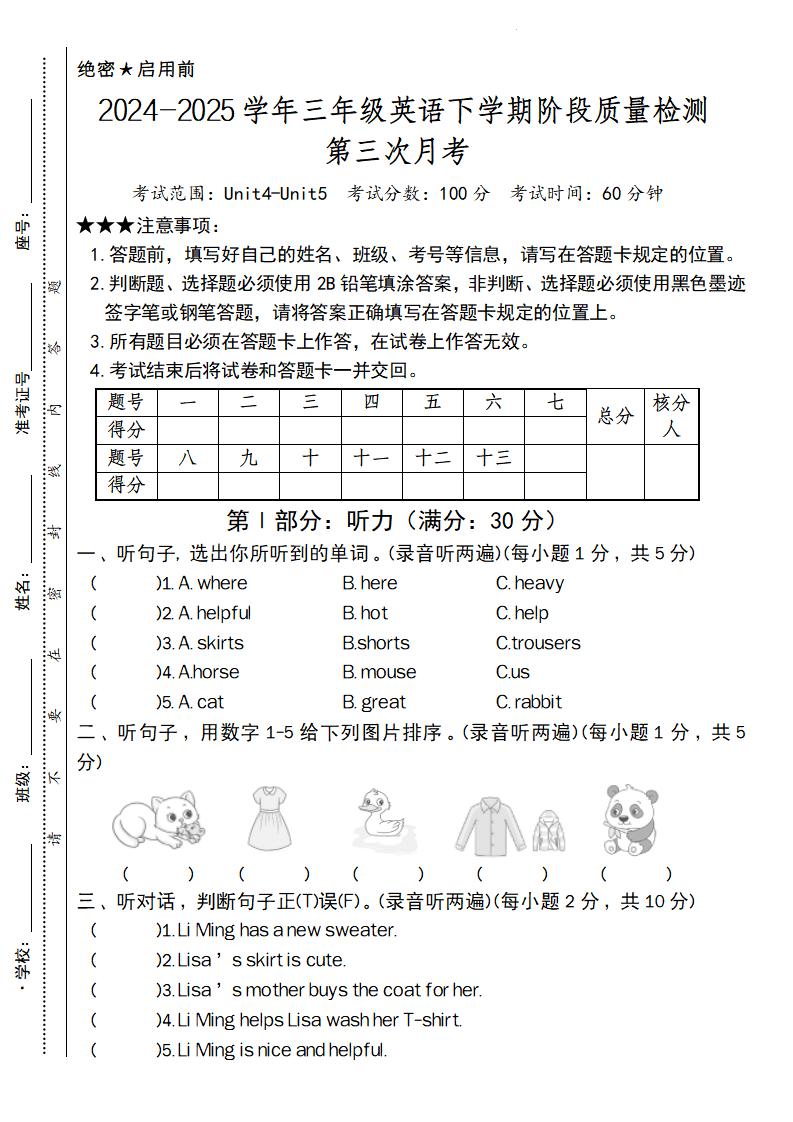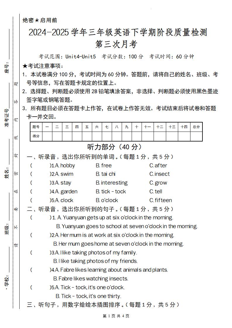 【英语】【人教精通版】2024-2025学年三年级英语下学期阶段质量检测第三次月考