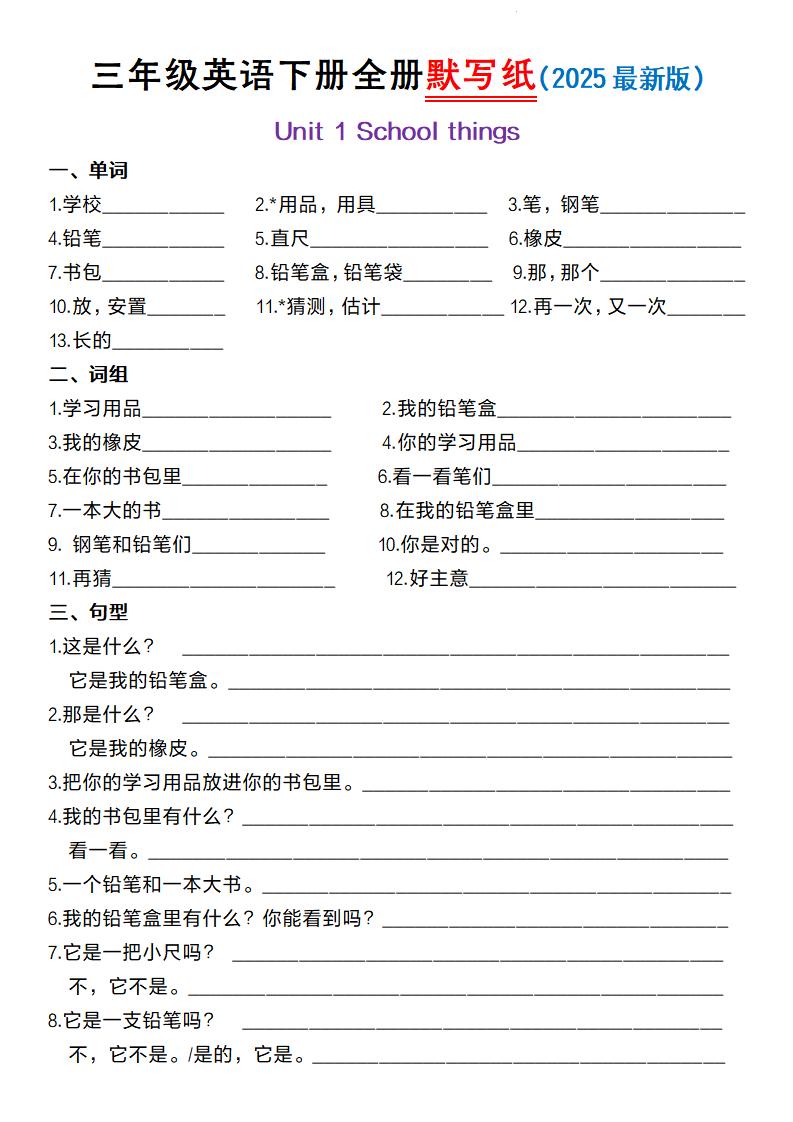 【英语】【译林(三起)】三年级英语下册全册默写纸(2025最新版)