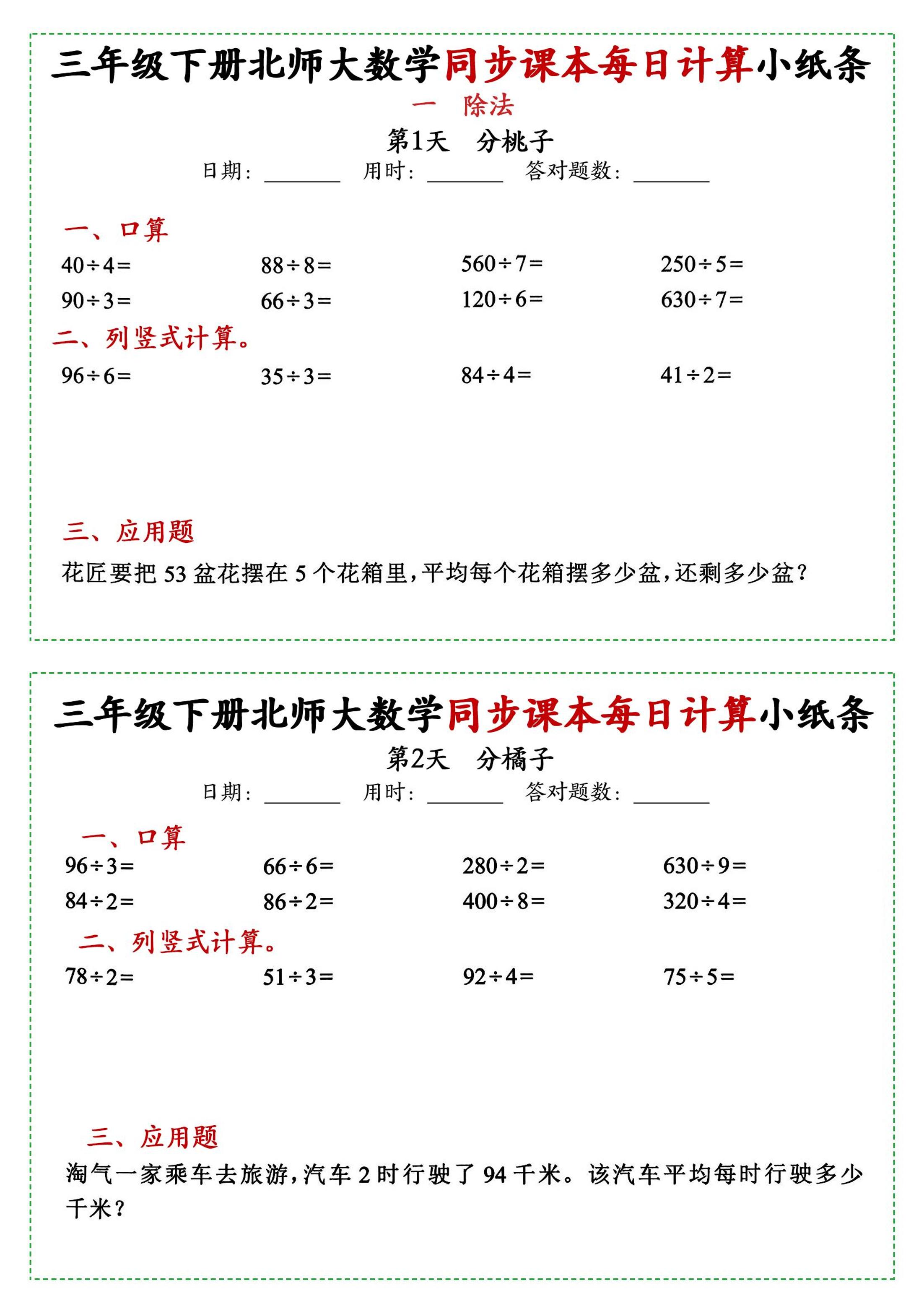 新三年级下册数学北师大版每日一练小纸条65天38页附答案