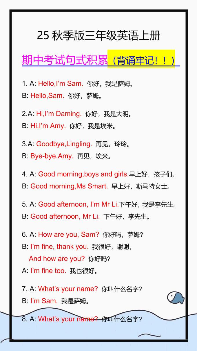 【2025秋新版】三年级英语上册期中考试句式积累,一定要掌握!