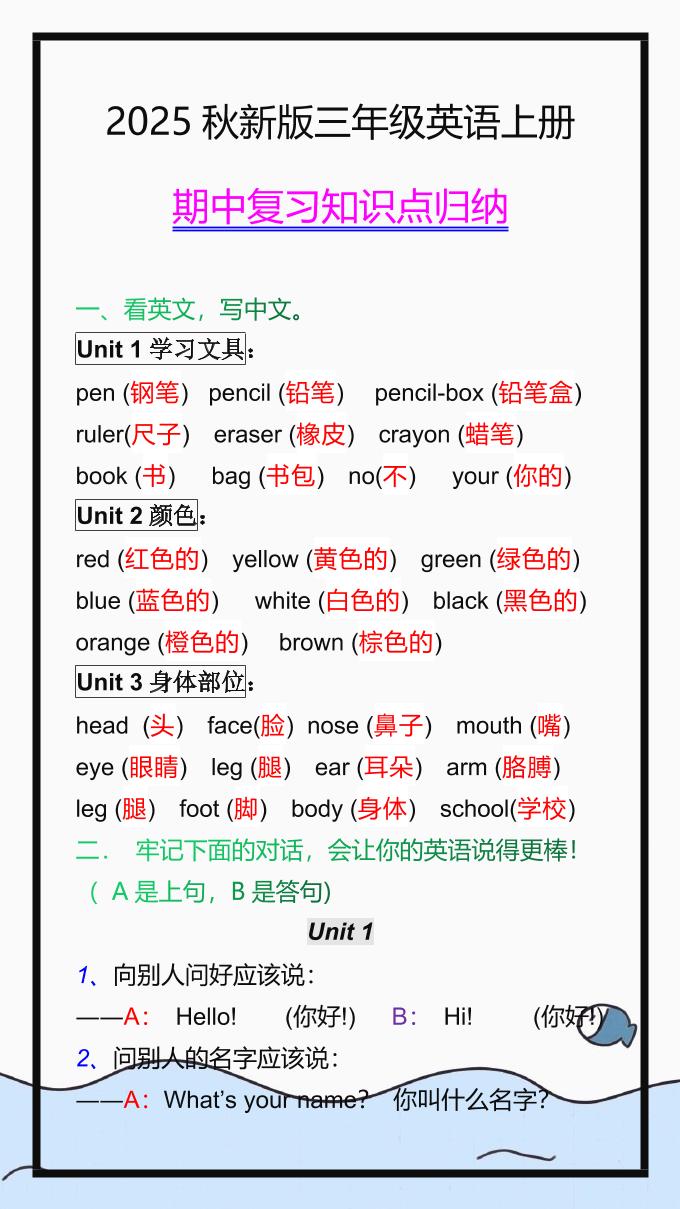 【2025秋新版】三年级英语上册期中复习知识点,掌握背诵!