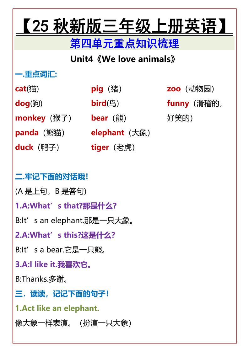 【2025秋新版】【三年级上册英语】期中复习资料