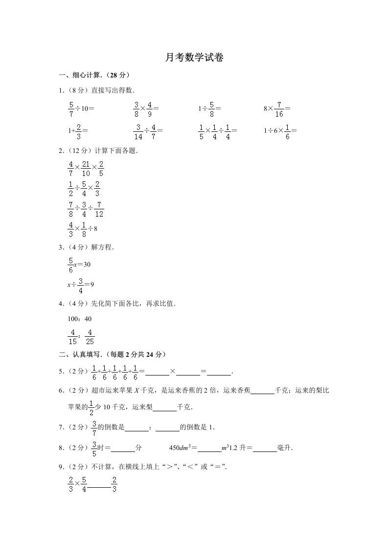 三(上)数学(苏教版)月考试卷 (含答案)