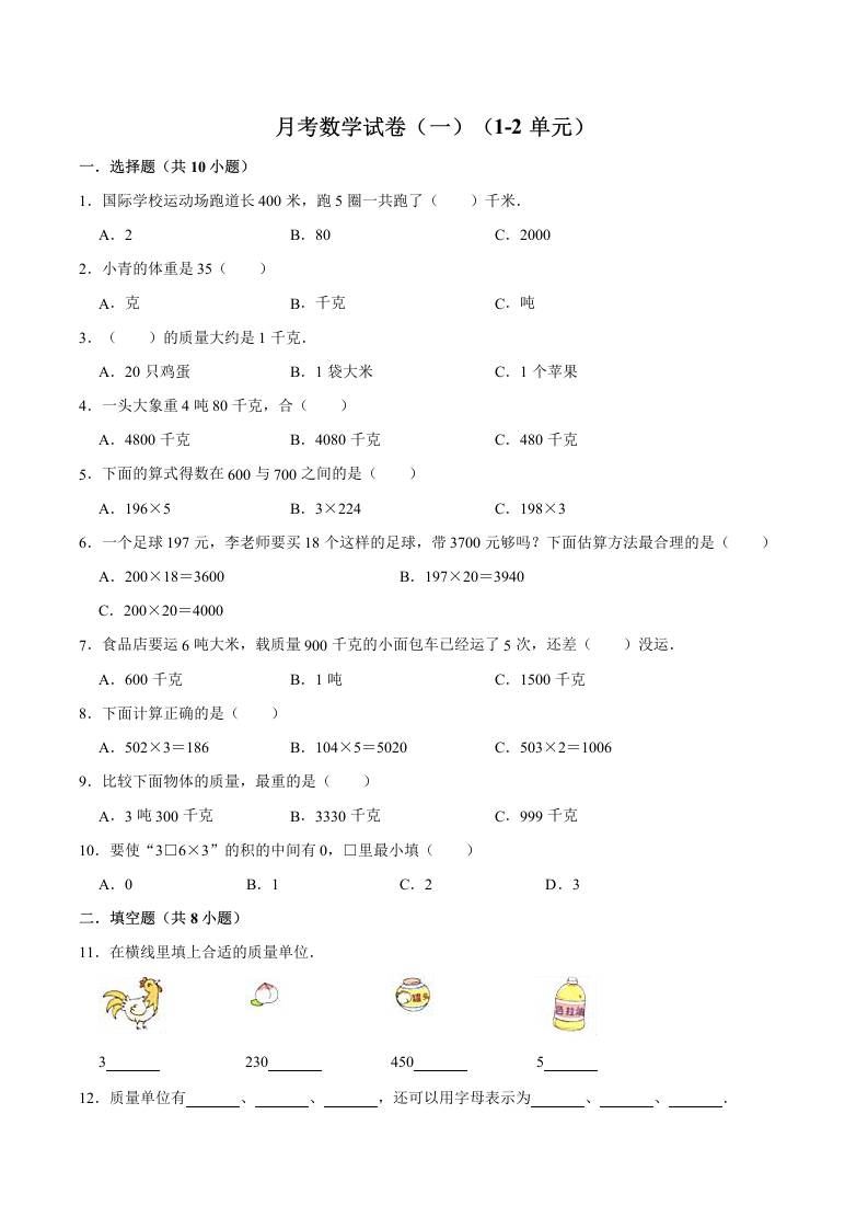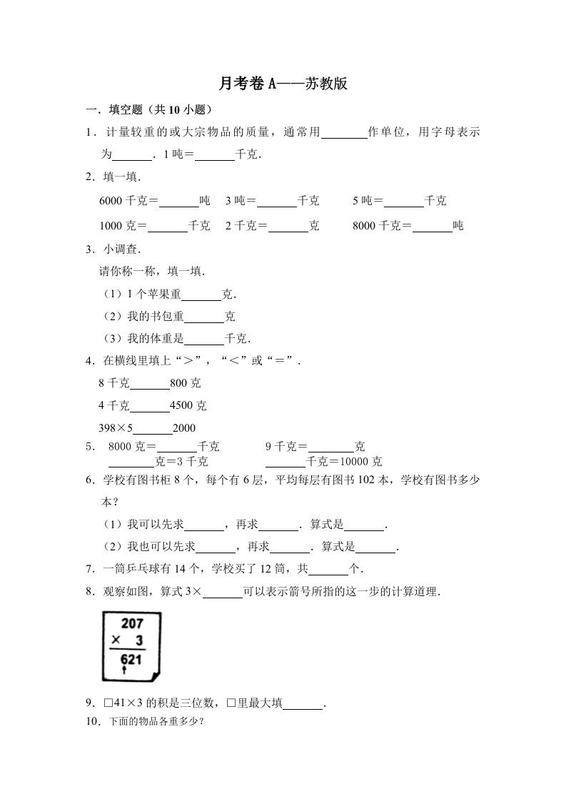 三(上)数学(苏教版)第一次月考卷A——苏教版(含答案)