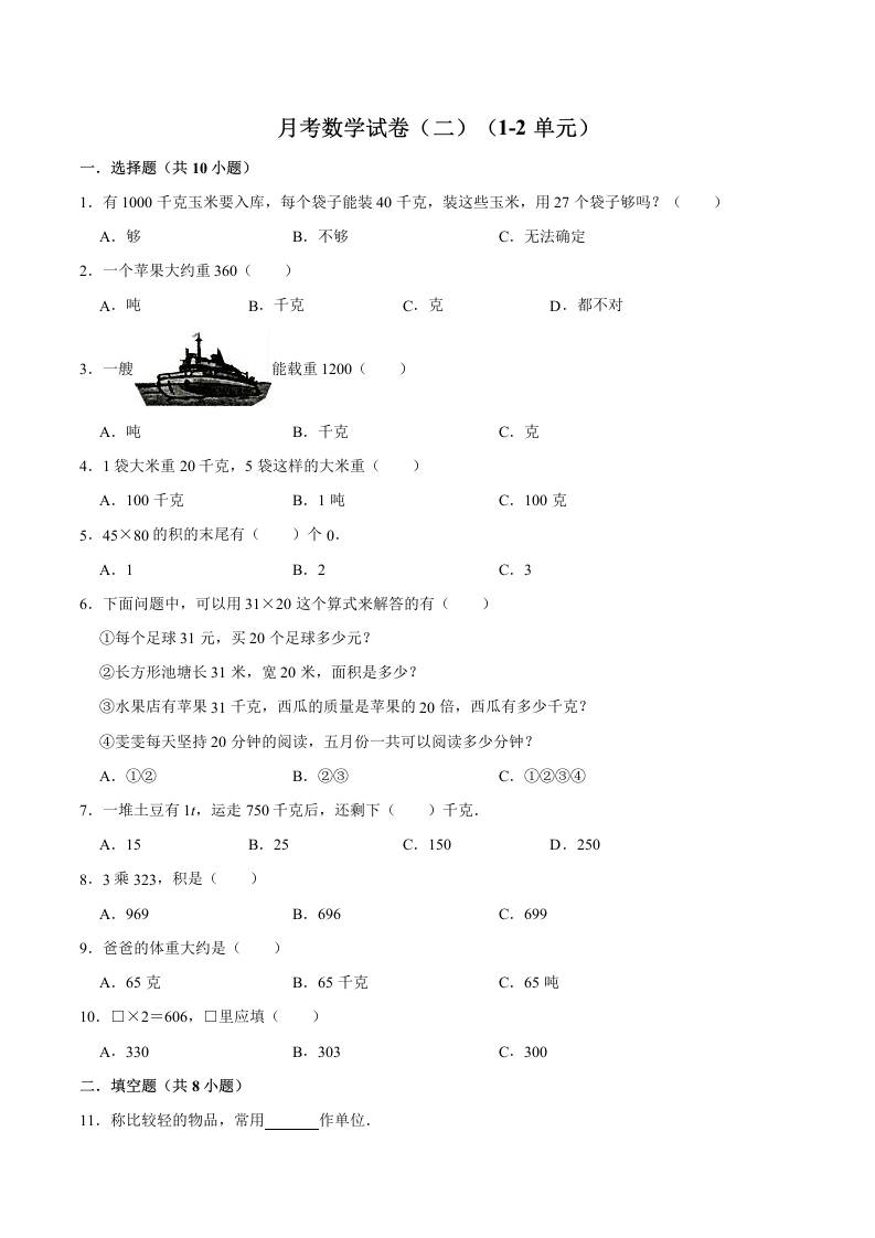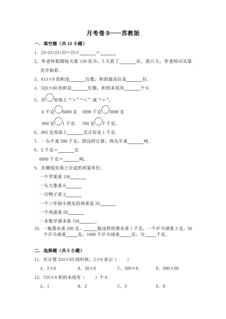 三(上)数学(苏教版)第一次月考卷B——苏教版(含答案)