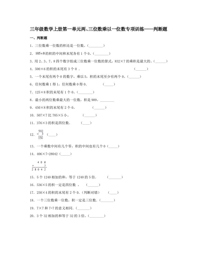 【题型专项特训】三年级数学上册第一单元两、三位数乘以一位数专项训练——判断题(苏教版,含答案)