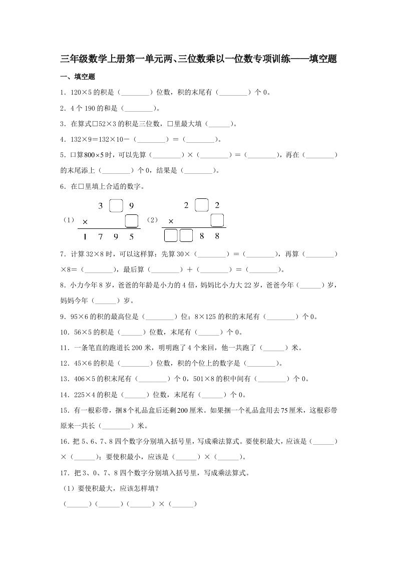 【题型专项特训】三年级数学上册第一单元两、三位数乘以一位数专项训练——填空题(苏教版,含答案)