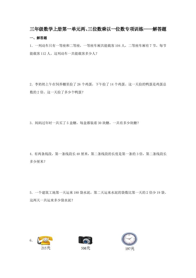 【题型专项特训】三年级数学上册第一单元两、三位数乘以一位数专项训练——解答题(苏教版,含答案)