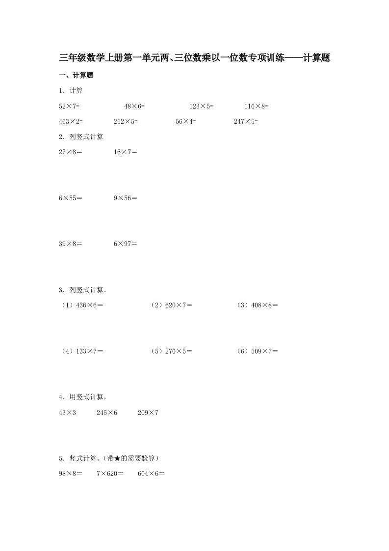 【题型专项特训】三年级数学上册第一单元两、三位数乘以一位数专项训练——计算题(苏教版,含答案)