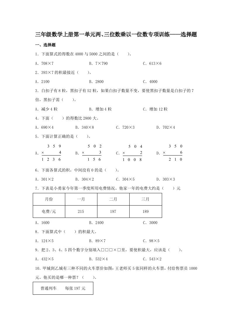 【题型专项特训】三年级数学上册第一单元两、三位数乘以一位数专项训练——选择题(苏教版,含答案)