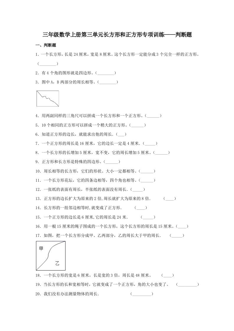 【题型专项特训】三年级数学上册第三单元长方形和正方形专项训练——判断题(苏教版,含答案)