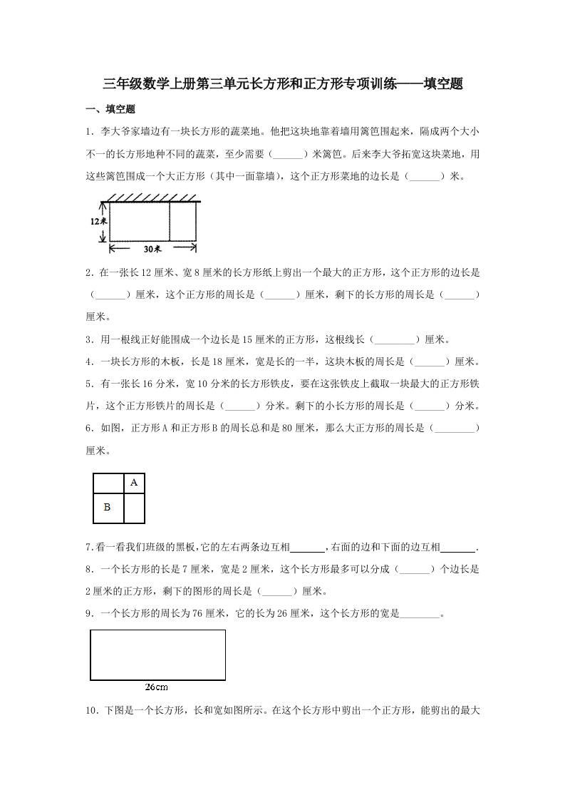 【题型专项特训】三年级数学上册第三单元长方形和正方形专项训练——填空题(苏教版,含答案)