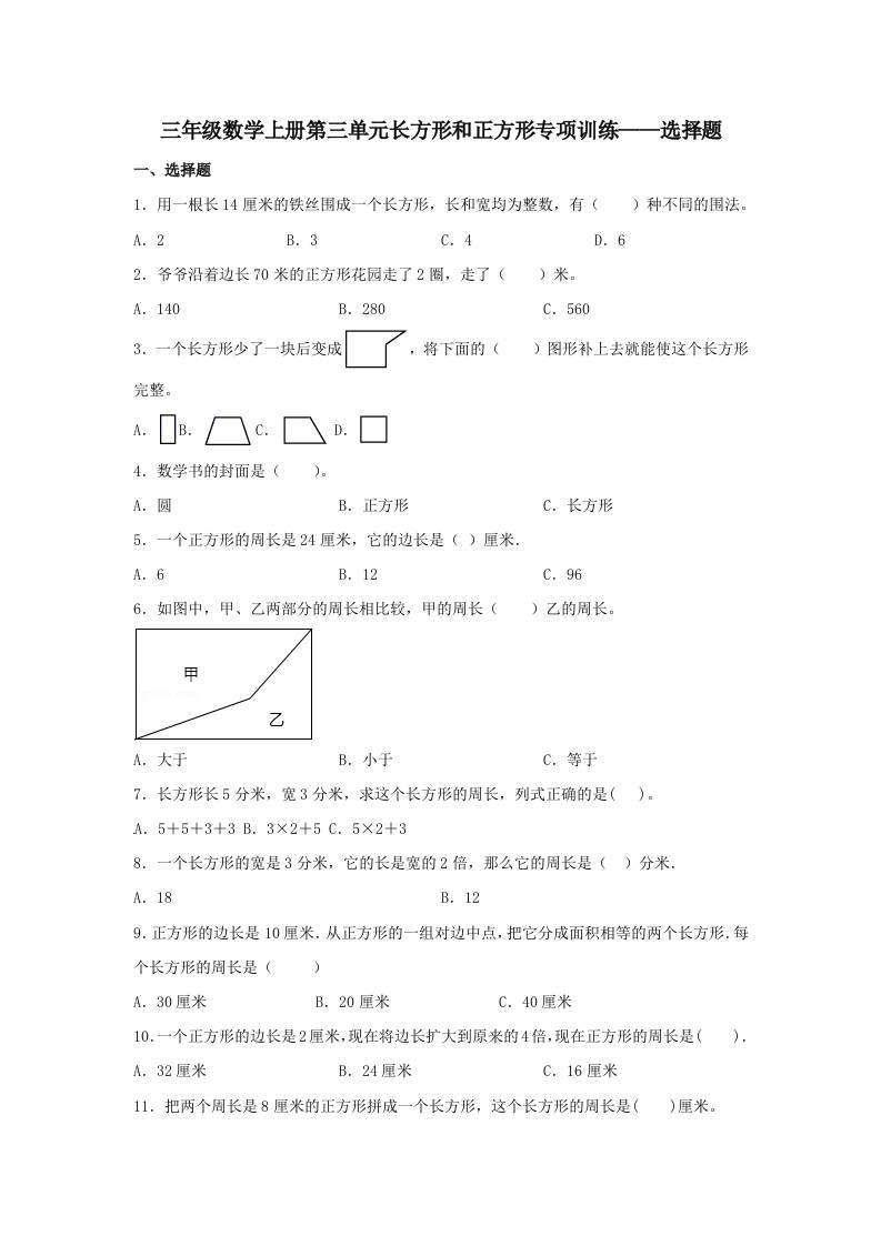 【题型专项特训】三年级数学上册第三单元长方形和正方形专项训练——选择题(苏教版,含答案)