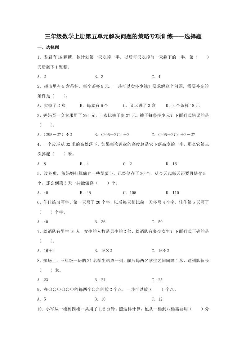 【题型专项特训】三年级数学上册第五单元解决问题的策略专项训练——选择题(苏教版,含答案)