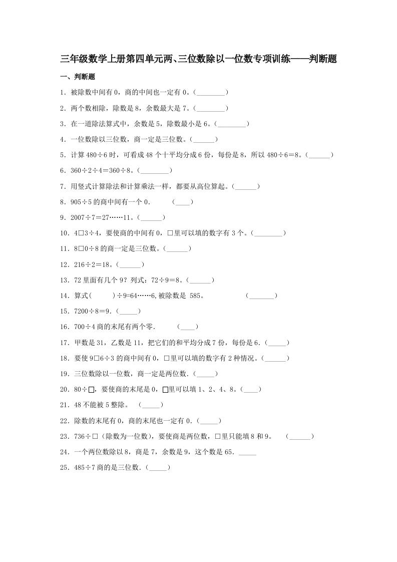 【题型专项特训】三年级数学上册第四单元两、三位数除以一位数专项训练——判断题(苏教版,含答案)