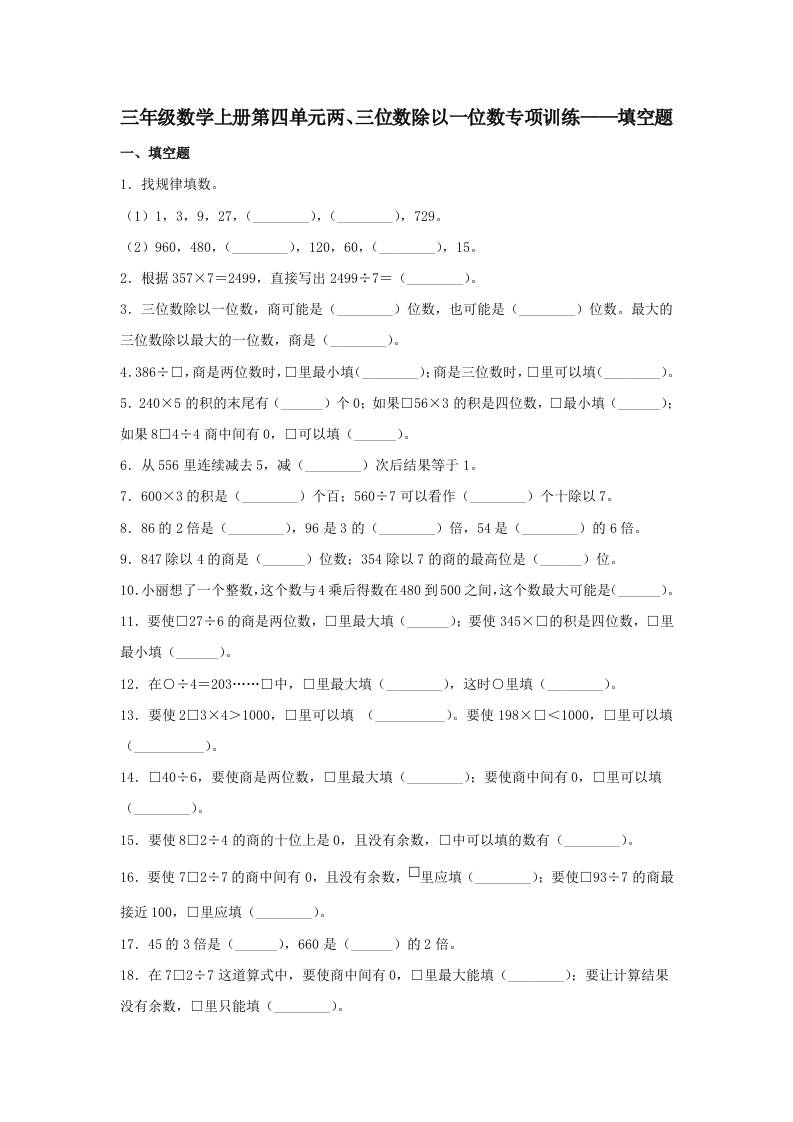 【题型专项特训】三年级数学上册第四单元两、三位数除以一位数专项训练——填空题(苏教版,含答案)