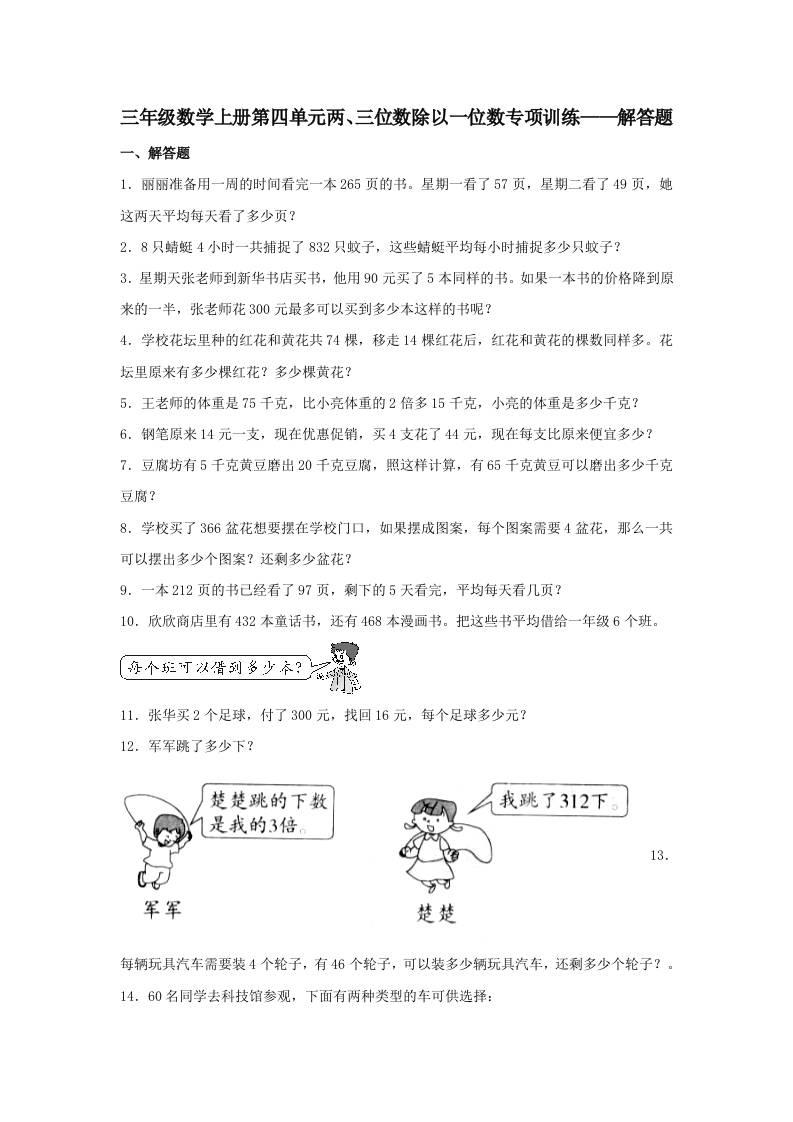 【题型专项特训】三年级数学上册第四单元两、三位数除以一位数专项训练——解答题(苏教版,含答案)