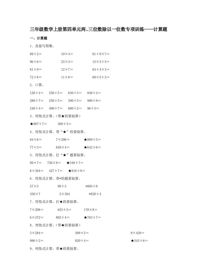 【题型专项特训】三年级数学上册第四单元两、三位数除以一位数专项训练——计算题(苏教版,含答案)