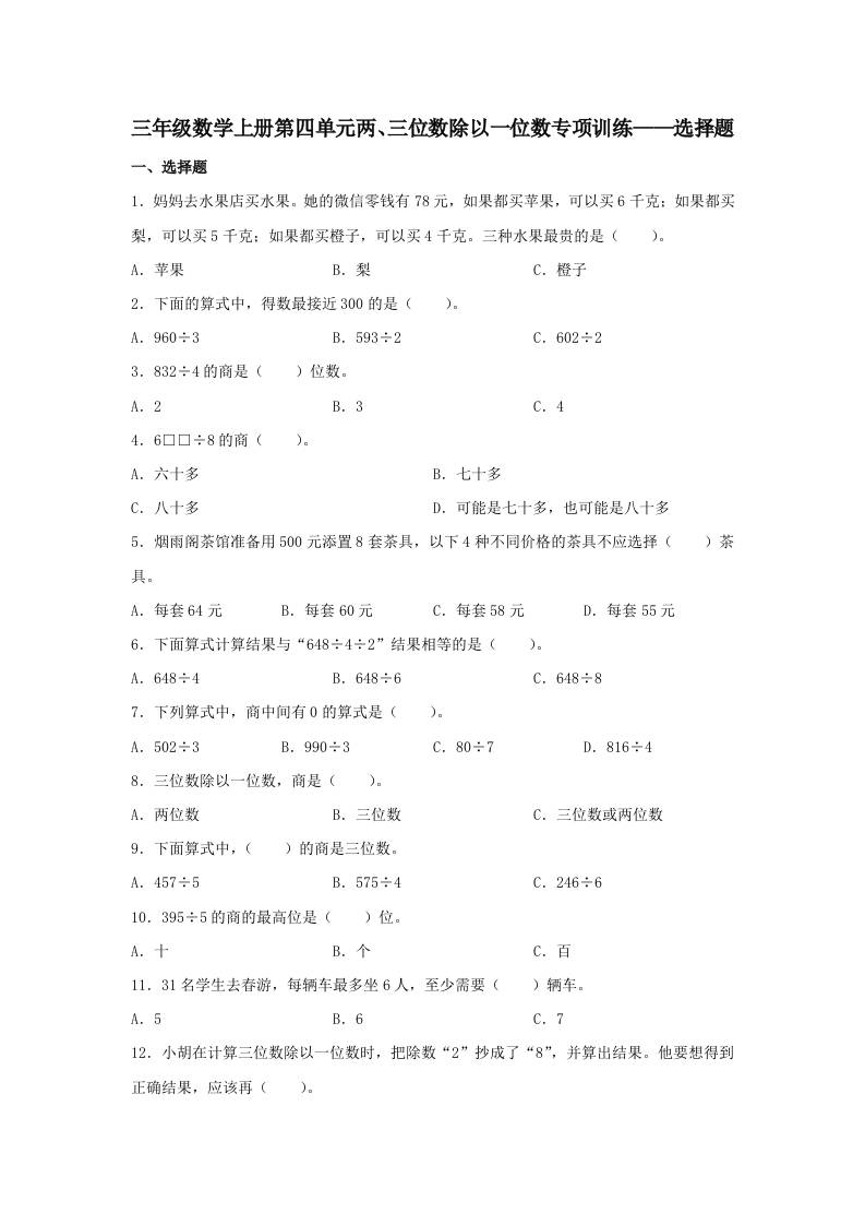 【题型专项特训】三年级数学上册第四单元两、三位数除以一位数专项训练——选择题(苏教版,含答案)