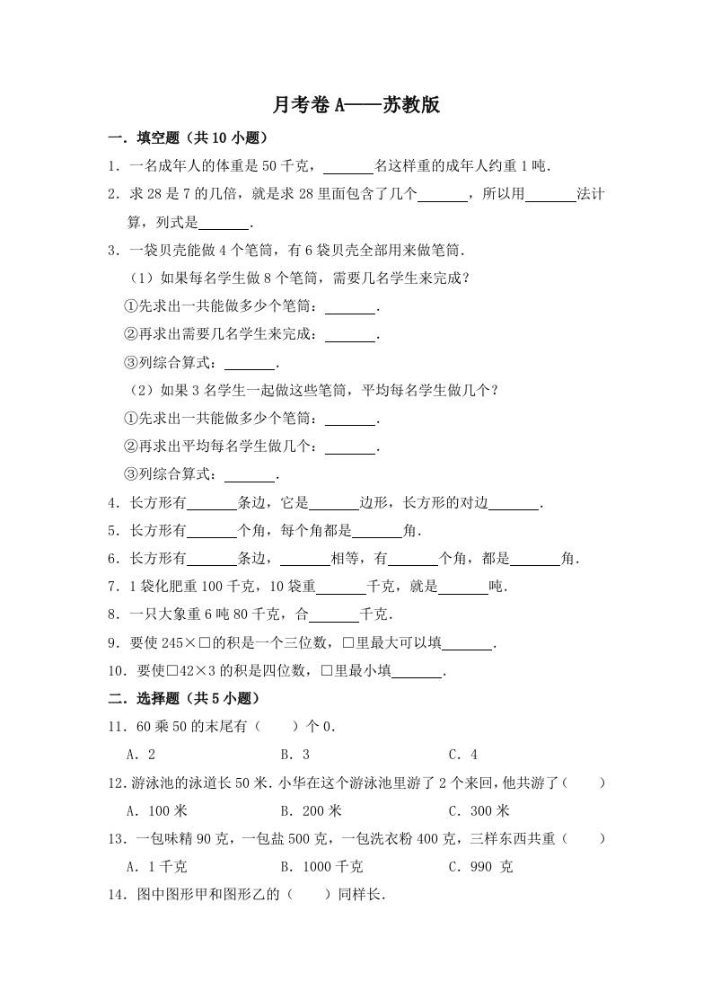 三(上)数学(苏教版)第二次月考卷A——苏教版(含答案)