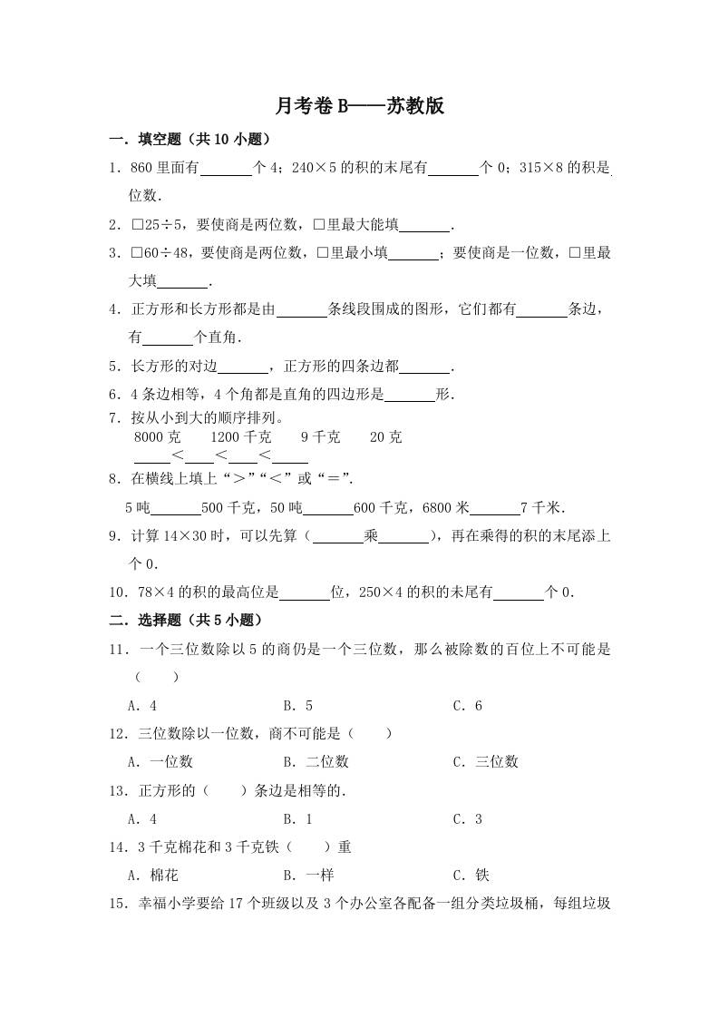 三(上)数学(苏教版)第二次月考卷B——苏教版(含答案)