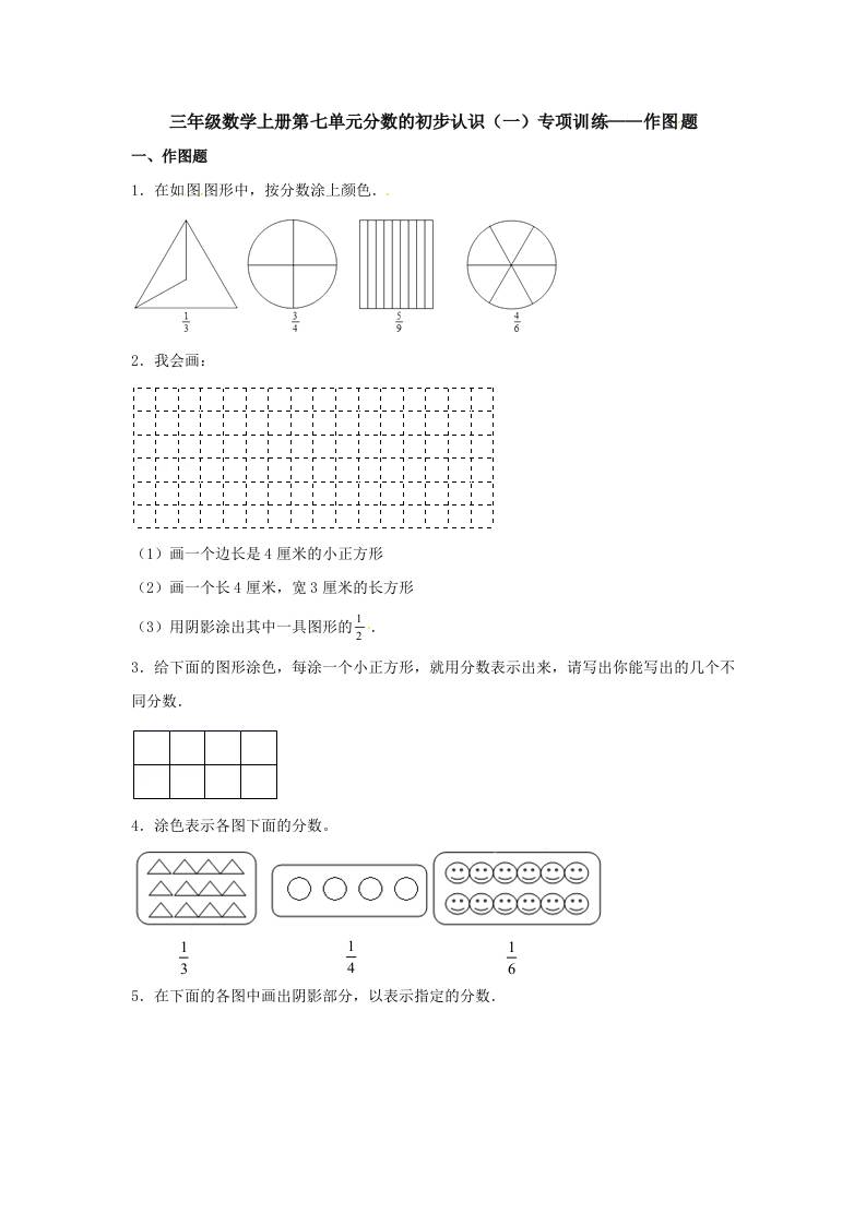 【题型专项特训】三年级数学上册第七单元分数的初步认识(一)专项训练——作图题(苏教版,含答案)