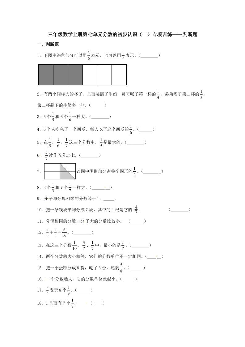 【题型专项特训】三年级数学上册第七单元分数的初步认识(一)专项训练——判断题(苏教版,含答案)