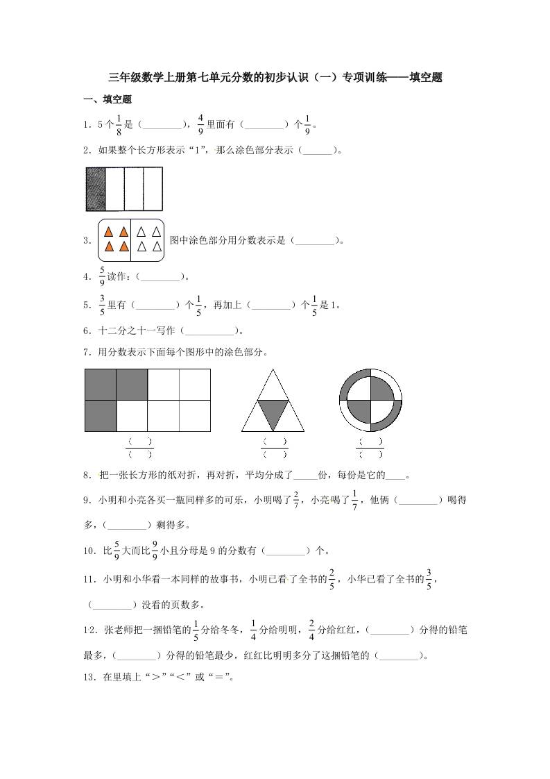 【题型专项特训】三年级数学上册第七单元分数的初步认识(一)专项训练——填空题(苏教版,含答案)