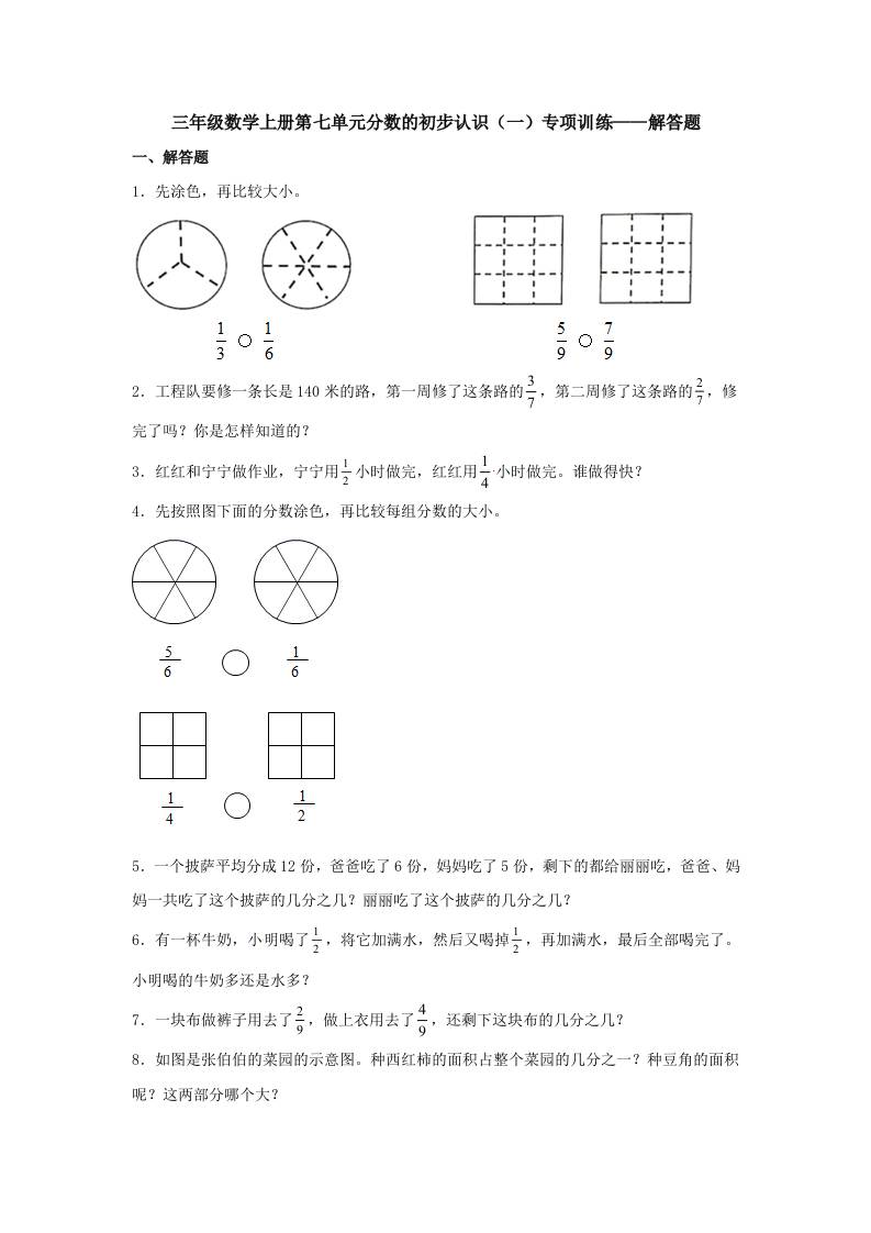 【题型专项特训】三年级数学上册第七单元分数的初步认识(一)专项训练——解答题(苏教版,含答案)