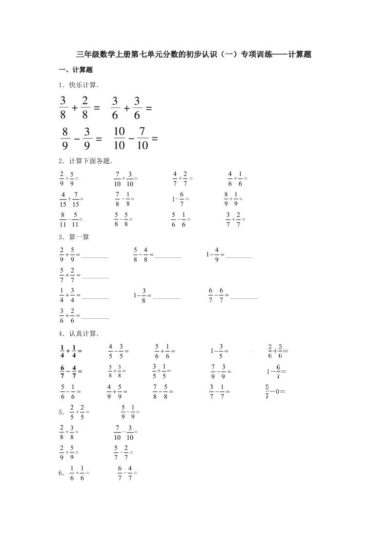 【题型专项特训】三年级数学上册第七单元分数的初步认识(一)专项训练——计算题(苏教版,含答案)