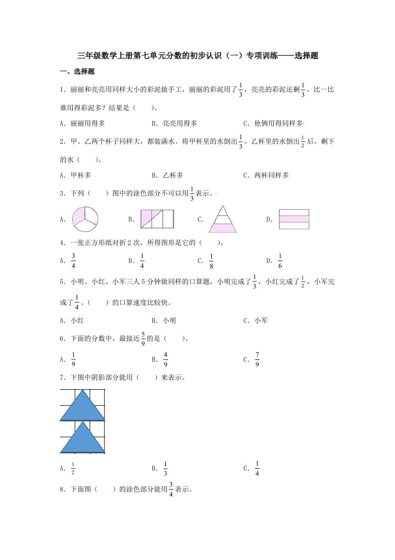 【题型专项特训】三年级数学上册第七单元分数的初步认识(一)专项训练——选择题(苏教版,含答案)