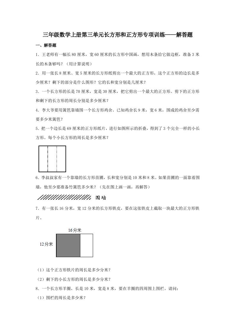 【题型专项特训】三年级数学上册第三单元长方形和正方形专项训练——解答题(苏教版,含答案)