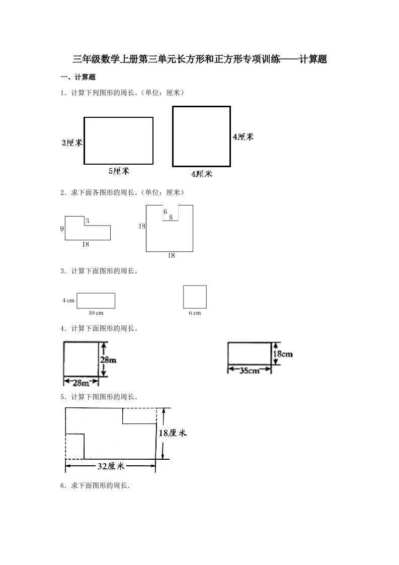 【题型专项特训】三年级数学上册第三单元长方形和正方形专项训练——计算题(苏教版,含答案)