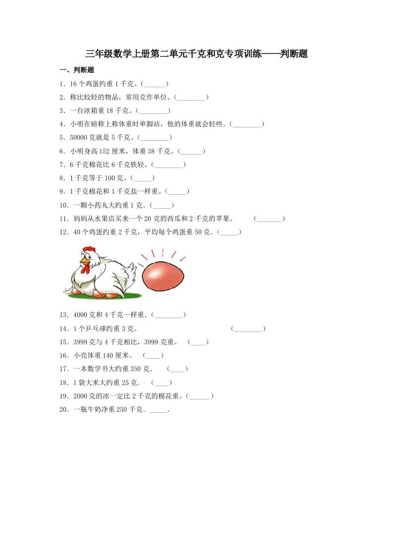 【题型专项特训】三年级数学上册第二单元千克和克专项训练——判断题(苏教版,含答案)