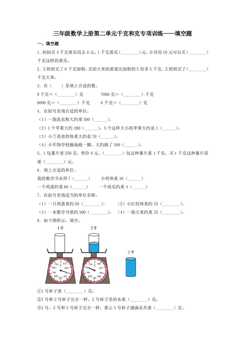 【题型专项特训】三年级数学上册第二单元千克和克专项训练——填空题(苏教版,含答案)