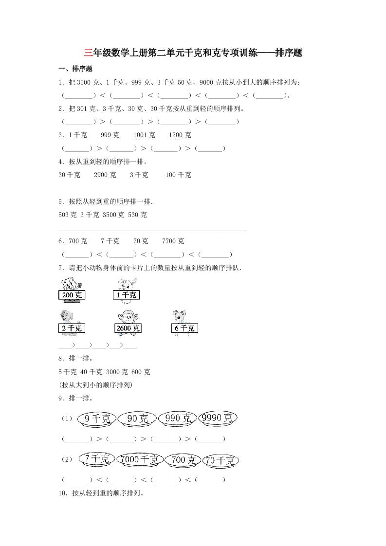 【题型专项特训】三年级数学上册第二单元千克和克专项训练——排序题(苏教版,含答案)