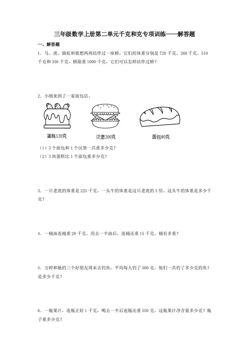 【题型专项特训】三年级数学上册第二单元千克和克专项训练——解答题(苏教版,含答案)