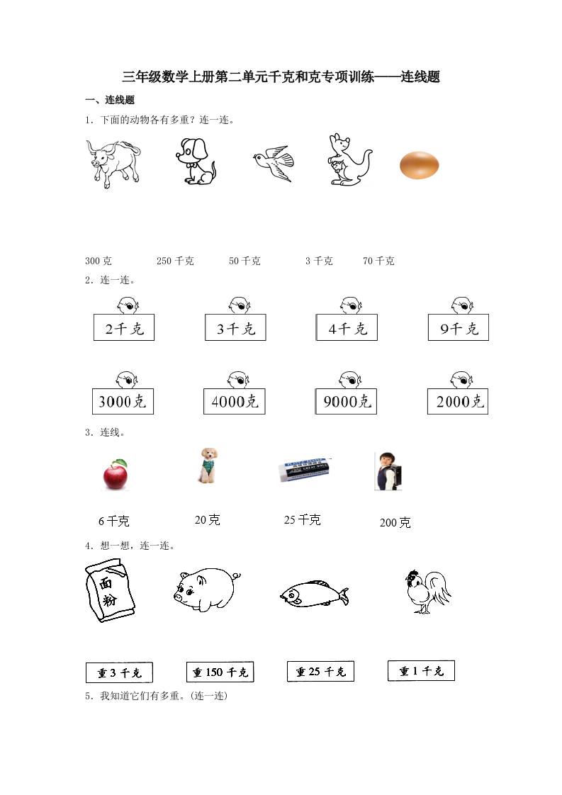 【题型专项特训】三年级数学上册第二单元千克和克专项训练——连线题(苏教版,含答案)