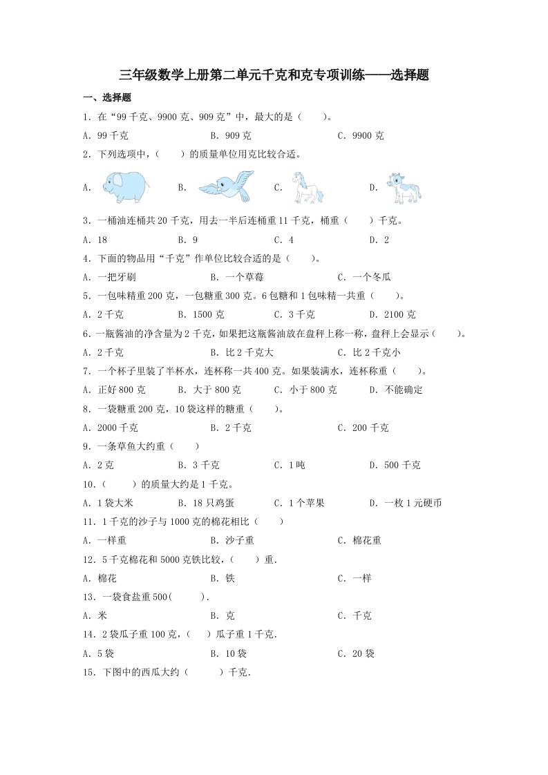 【题型专项特训】三年级数学上册第二单元千克和克专项训练——选择题(苏教版,含答案)